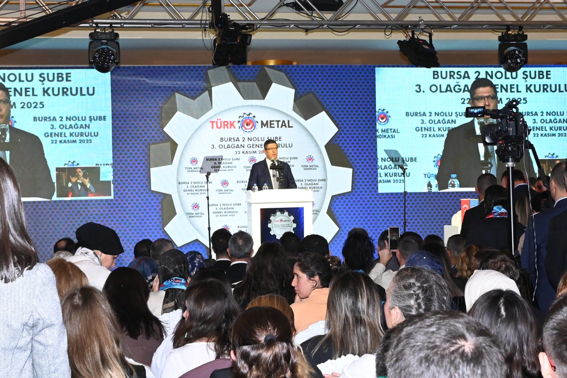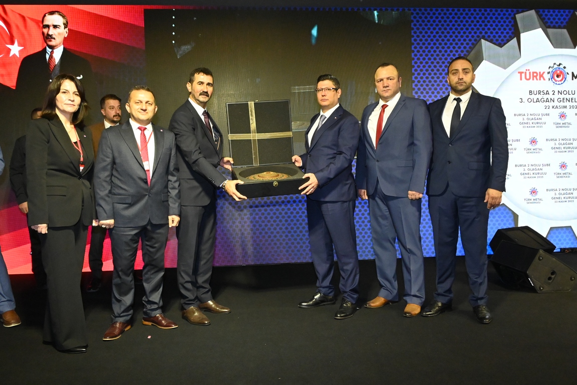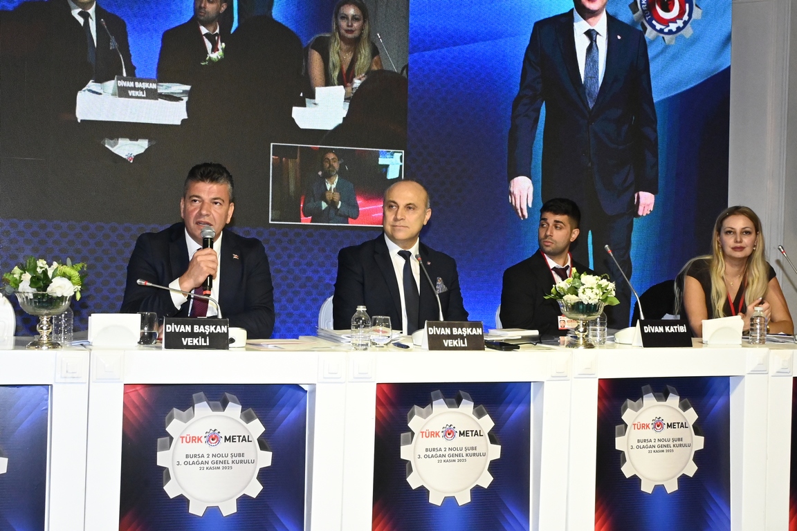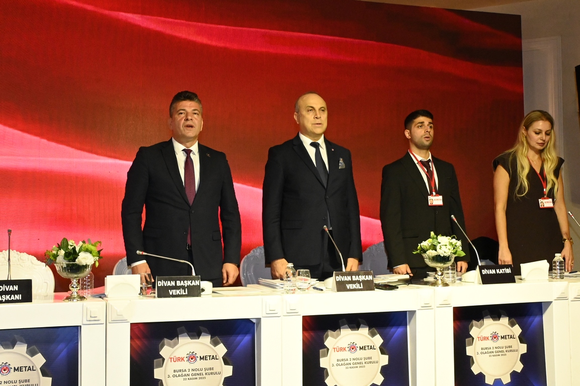 Bursa 2 Nolu Şubemizin 3. Olağan Genel Kurulu 22 Kasım 2025 Cumartesi günü Genel Başkanımız Uysal Altundağ’ın katılımıyla gerçekleştirildi. Genel Kurulu yönetecek Divan Heyeti’nin teşekkülü ile başlayan genel kurulda, Divan Başkanlığına Genel Başkanımız Uysal Altundağ, Divan Başkan Vekilliklerine Genel Başkan Yardımcımız Mesut Erdem ve Genel Sekreterimiz Taliphan Kıymaz, Divan Kâtip üyeliklerine ise Rollmech işyeri delegesi İnci Yılmaz ve Feka Otomotiv işyeri delegesi Ahmet Yiğit Alptekin seçildi.