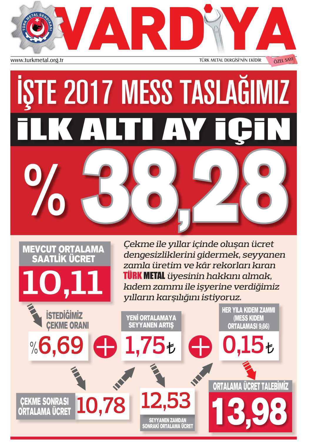 Sendikamız Türk Metal, Türkiye Metal Sanayicileri Sendikası (MESS) ile 117 bin üyemiz adına yürüteceği grup toplu iş sözleşmesi görüşmeleri öncesi teklif taslağını 2 Ağustos 2017 tarihinde beş ayrı bölgede yaptığı toplantılarda açıkladı. Taslağa göre ilk 6 ay için üyelerimizin saatlik ücretlerine önce çekme uygulamasıyla yüzde 6,69 oranında bir iyileştirme (Haberin sonunda yayınladığımız ve işyerlerinde de dağıttığımız vardiya gazetesinde çekmeden faydalanan yıllar ve çekme ile gelinecek taban ücretleri belirtilmiştir. Taban ücretin altında kalan saat ücretlerimiz taban ücretine çekilmektedir.) yapılmasını, ardından seyyanen tüm üyelerimizin saat ücretlerine 1 lira 75 kuruş zam alınmasını, son olarak da her kıdem yılı için 15 kuruş artış sağlanmasını talep ediyoruz. Böylece ilk 6 ay için talep ettiğimiz artış tutarı ortalamada yüzde 38,28 oluyor.