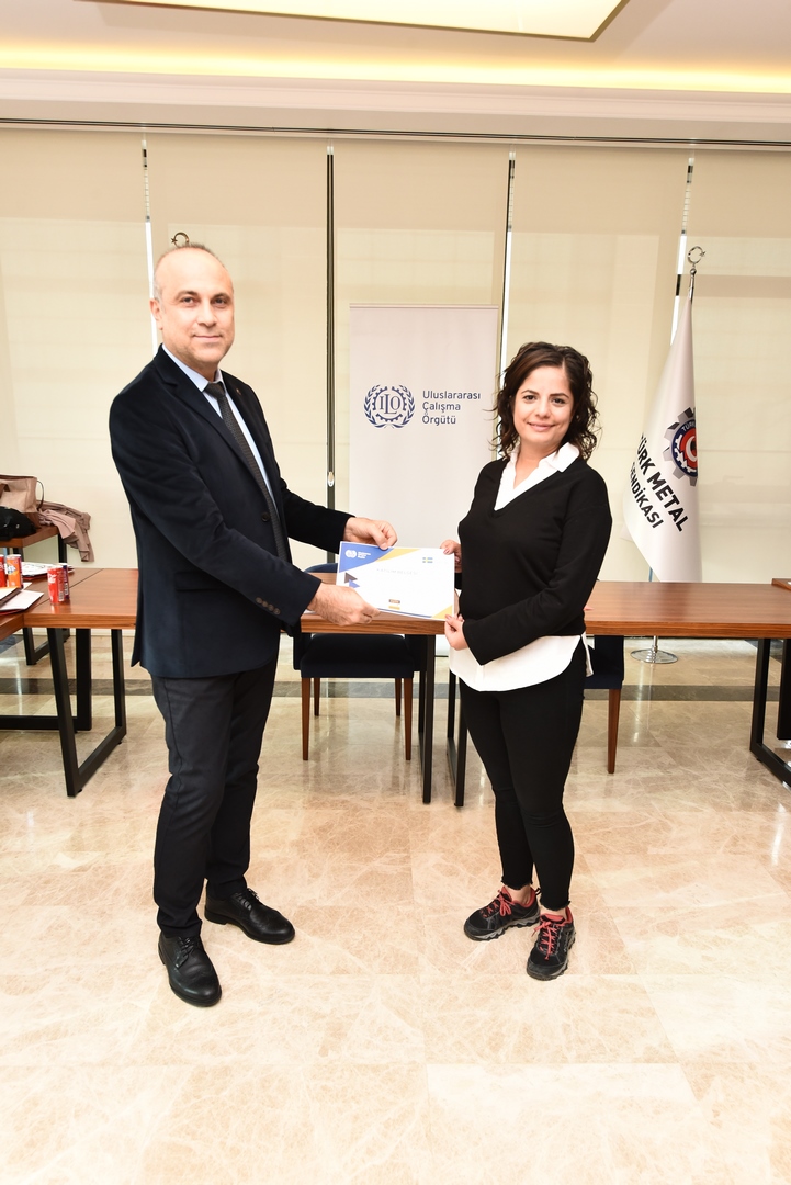 İki gün süren Çalıştay düzenlenen sertifika töreni ile sona erdi. Sertifika törenine katılan Genel Sekreter Taliphan Kıymaz, Türk Metal’in ILO ile yürüttüğü işbirliğinden duyduğu memnuniyeti dile getirdi ve “Belgede yer alan ifadeleri güvence altına alabilmek için en kısa sürede çalışmalarımıza başlayacağız” dedi.