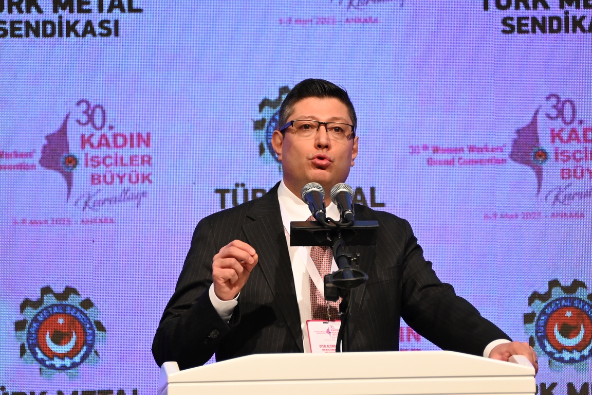 Genel Başkanımız Altundağ, yaşadığımız bütün toplumsal problemlerin, sosyal adaletsizliğin, ekonomik sorunların, küresel sistem denilen bu dengesizliğin bir çaresi olduğunu ve bu çarenin adının sendika olduğunu vurgularken, “Çünkü sendika demek ekonominin kayıt altına alınması, çalışma hayatında kural ve prensiplerin olması demektir. Hak mücadelesinin mümkün ve meşru olması yani hukuki bir zemininin olması demektir. İnsana yaraşır çalışma koşulları, iş ve gelecek güvencesi demektir. Bireysel olarak gelişme, sosyal yaşam içinde kadının özgür olması demektir. Sadece bu kadar mı? Değil tabii. Sendika çalışma hayatında erkeklerden daha düşük ücrete mahkûm edilen kadınların olmaması demektir. Krizde işten ilk çıkartılan, hamile kalınca işine son verilen kadınların olmaması demektir. Anne olunca iş bulamayan, işi olsa bile süt izni alamayan, çocuğunu bırakacak kreş bulamayan kadınların olmaması demektir. Kısaca sendika emekçinin, özellikle de kadın emekçilerin yuvası olduğu kadar da kalesidir. Başka bir değişle sendika emekçileri hayata karşı savunan, onları her türlü belirsizliğe ve olumsuzluğa karşı koruyan güçlü bir sistemdir. Çok şükür biz, Türk Metal Sendikası olarak, örgütlenme becerisi Dünyadaki en büyük sendikalardan biriyiz. Bu büyüklüğün arkasında sizler varsınız. Sizin azminiz ve inancınız, sizin mücadeleniz ve dayanışma gücünüz var. Tüm bunlar yıllar içinde sendikamızı, metal emekçilerinin en korunaklı yapısı haline getirdi” dedi.