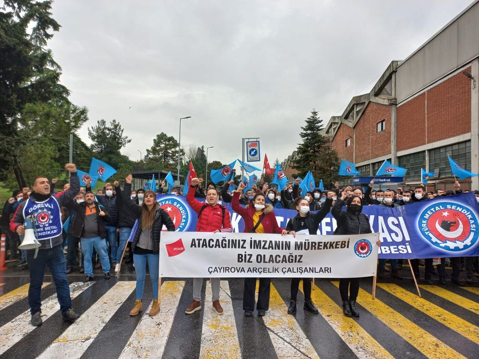 Sendikamız Türk Metal ile Türkiye Metal Sanayicileri Sendikası (MESS) arasında başlayan sözleşme görüşmelerinin tıkanması üzerine, 10 Aralık tarihinde toplanan Başkanlar Kurulumuzda alınan kararlar doğrultusunda başlayan eylemler fabrikalara taşındı. Metal emekçileri 14 Aralık tarihinde MESS Merkez Ofisi ve Bölge Temsilcilikleri önünde başladıkları eylemlere 16 Aralık 2021 Perşembe günü tüm vardiya giriş ve çıkışlarında alkışlı protestolarla devam etti. Fabrikalardaki vardiya giriş ve çıkışlarını ıslık sesleri ve alkışlarla inleten emekçiler, Türk Metal’in eylem sürecini sonuç alıncaya kadar devam ettirme kararlılığını da ortaya koydu.