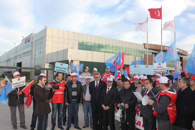 Hendek’teki sendikalaşmak isteyen AKPA Alüminyum emekçilerine karşı işverenin baskıcı ve antidemokratik tutumu Bolu, Sakarya ve Gölcük Şubelerimize bağlı yüzlerce üyemiz tarafından protesto edildi. Genel Sekreterimiz Yücel; konuyla ilgili basın açıklaması yaptı.