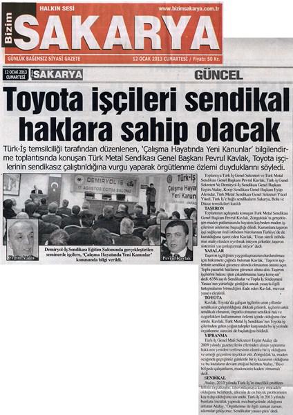 Türk-İş Genel Sekreteri ve Sendikamız Genel Başkanı Pevrul Kavlak; Sakarya’da Türk-İŞ Bölge Toplantısının açılışında konuştu. Konuşmasında TOYOTA iş yerinde örgütlenme çalışmalarını başlattıklarını söyleyerek “Türk Metal, Toyota işçisinin sendika özlemine son verecektir. Türk Metal, çok yakın bir zamanda, TOYOTA'ya bayrağını dikecektir. Çağdaş sendikacılık anlayışıyla, iş barışını gözeten yaklaşımıyla, sosyal diyaloga verdiği önemle, TOYOTA'da olacaktır” dedi.