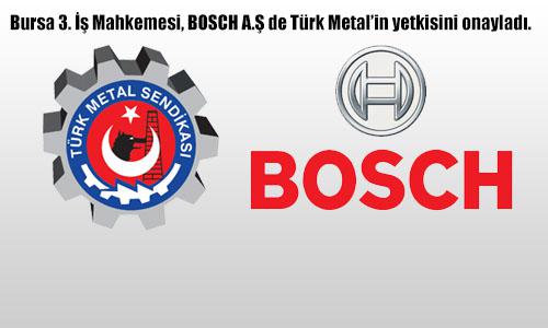 BOSCH A.Ş’de çalışan arkadaşlarımızın hem emekleri hem de ekmekleriyle oynamayı, mahkeme mahkeme dolaşarak iki yıldan bu yana sürdüren ve bu duyarsızlığı ‘sendikacılık’ olarak göstermek isteyenlere Türk Adaleti, okkalı bir Osmanlı Tokadı vurarak, “BOSCH İŞLETMESİNDE TÜRK METAL SENDİKASI YETKİLİDİR” dedi.