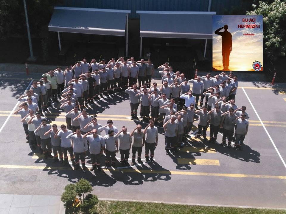 Artan terör saldırılarına tepki olarak ve ayrıca terör saldırıları sonucunda şehit düşen askerlerimize saygımızın bir ifadesi olarak yaklaşık 500 iş yerinde 100 bine yakın metal işçisi Türk Bayrağı açarak selam durdu.