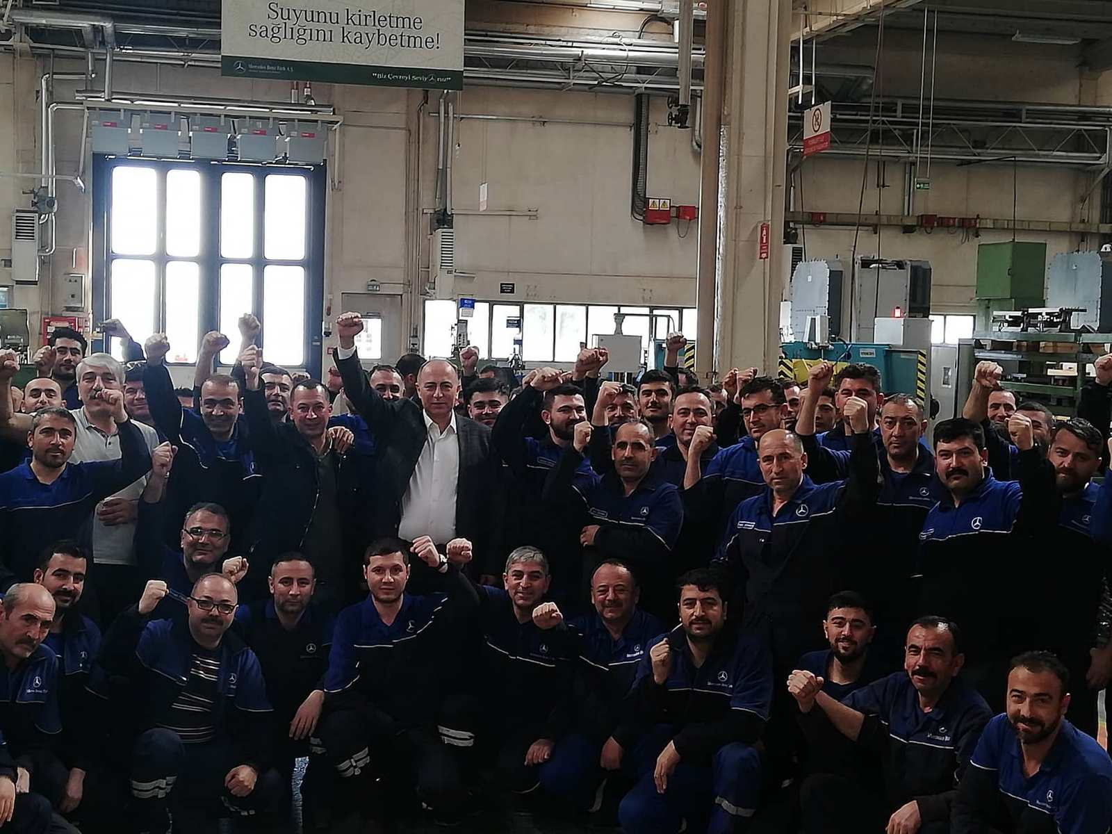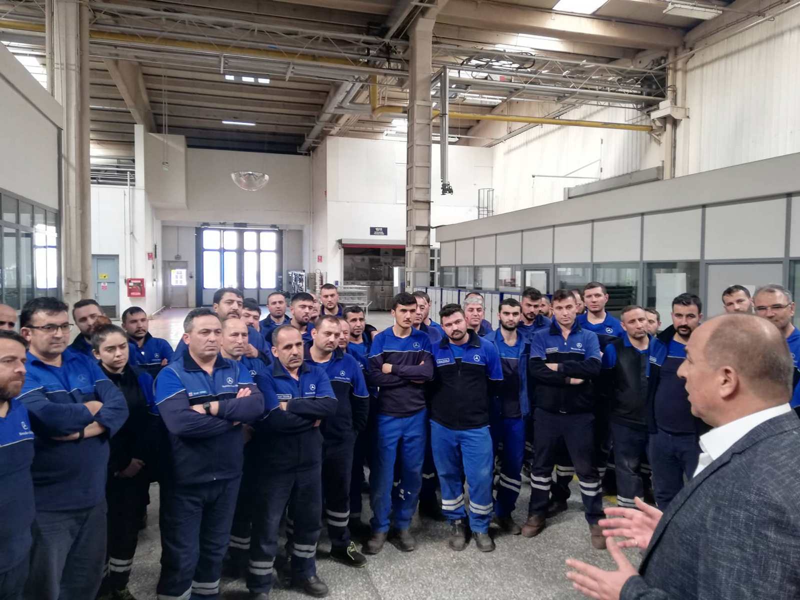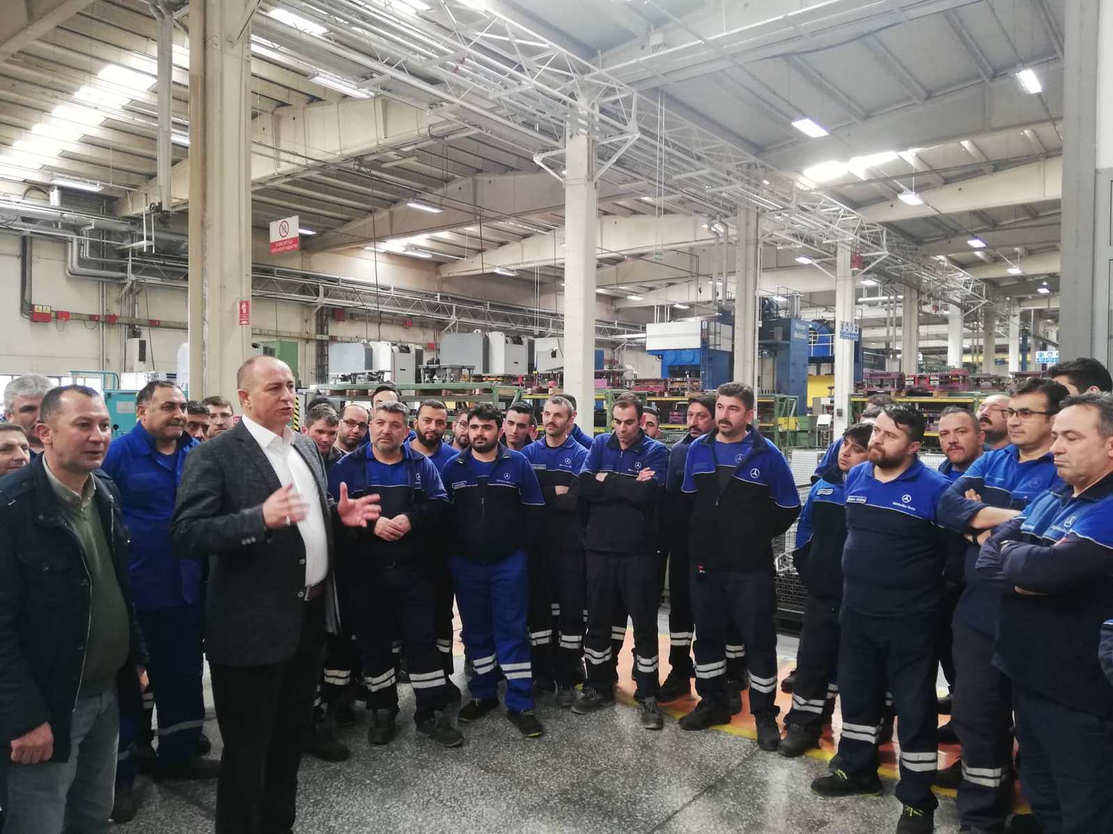 2019 - 2021 Mess Grup Toplu İş Sözleşmemiz sonrası Şubemize bağlı Mercedes Benz Türk A.Ş. işyeri ziyaretinde bulunan Şube Başkanımız Muhterem Taşdemir, Hol 3 Bant Besleme ve Parça İmalat bölümlerinde tezgahları başında çalışan üyelerimizle görüşerek kolaylıklar diledi ardından pasta kesildi.