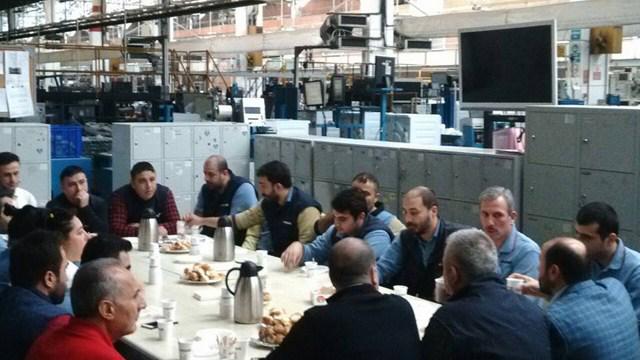 Şube Başkanımız Halil ERDAL 21 Kasım Pazartesi günü şubemize bağlı Arçelik ÇMİ işyeri İK Müdürü Çağlar TAŞKIN, Üretim Müdürü Haşmet ÇİZMECİ, Takım Lideri Yaşar CEYLAN ve her banttan 2 üyemizin de bulunduğu geleneksel Pazartesi kahvaltısına katıldı.