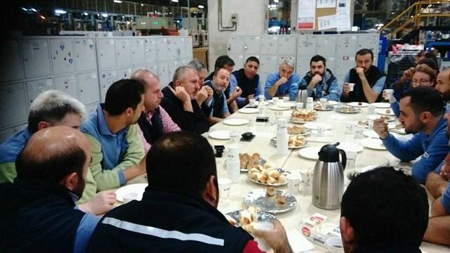 Şube Başkanımız Halil ERDAL 28 Kasım Pazartesi günü Şubemize bağlı Arçelik ÇMİ işyeri Ürün Direktörü Atilla UZ, İK Müdürü Çağlar TAŞKIN, Üretim Müdürü Haşmet ÇİZMECİ ve her banttan 2 üyemizin de bulunduğu fabrikadaki genel sorun ve sıkıntıların konuşulduğu Geleneksel Pazartesi Kahvaltısına katıldı.